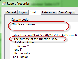 This can be achieved for example by using the Report Properties window, in the Code tab. Here you can enter comments using the Visual Basic synthax, using the ‘ sign.