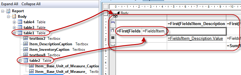 In table1 there’s a Detail, Header and Footer level. Because of ‘requirements’ you have to add an extra field in the first column. You don’t want to use an expression to concatenate two fields in one textbox, you want to have two textboxes because you need to format them separately. In RDLC 2008 this would be very simply acomplished by using a Placeholder, but in NAV 2009 we use RDLC 2005 and the Placeholder doesn’t exist yet 🙂