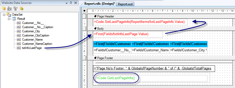 To be able to show a field in the dataset on a Footer (or Header) we will need to declare a Variable, a Set function and a Get function: