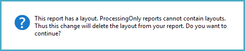 When you set ProcessingOnly to yes when you create a new report, then you can’t create a layout. But when you use it on a report that already has a layout then the following confirmation pops up: